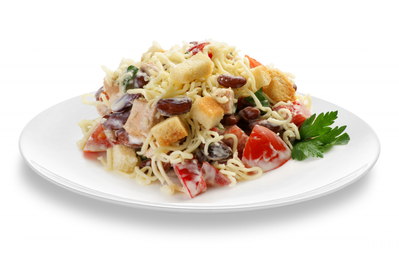 Салат из отварной красной фасоли, куриного филе, помидора, болгарского переца, сыра и зелени. Заправляется майонезом. Подается с сухариками.