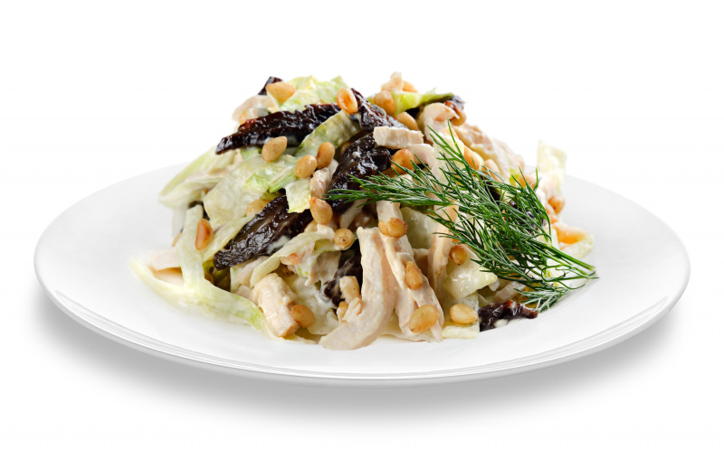 Салат из запеченной куриной грудки с листьями салата "айсберг", с добавлением чернослива и кедрового ореха. Заправляется майонезом.