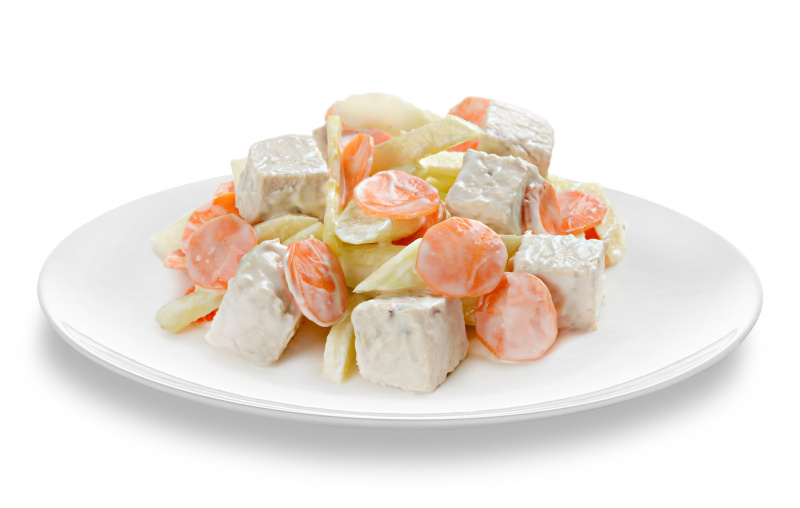 Салат из индейки с сельдереем, с добавлением моркови и яблок. Заправляется фирменной заправкой.