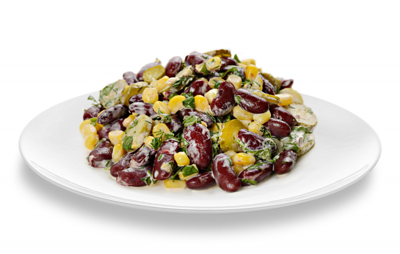 Салат из фасоли с добавлением маринованных огурцов и кукурузы. Заправляется майонезом.