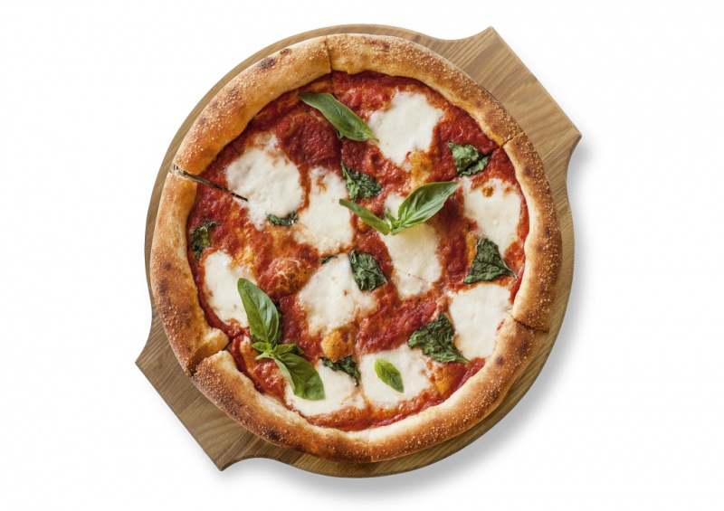 Пицца на основе бруклинского теста с сыром моцарелла, базиликом и томатным соусом.