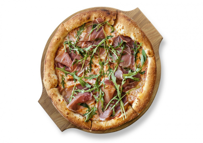 Пицца на основе бруклинского теста с окороком маттонелла, рукколой, моцареллой и томатным соусом.