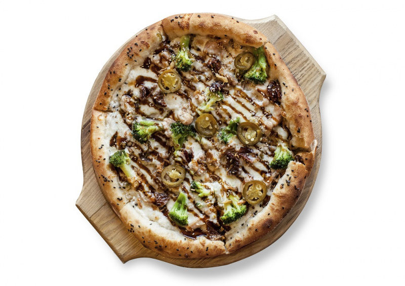 Пицца на основе бруклинского теста с цыпленком терияки, брокколи, вялеными томатами, кунжутом, луком, халапеньо и сливочным соусом.