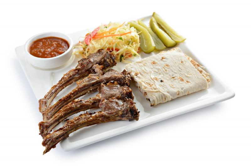 Баранья корейка, приготовленная на углях. Подается с лавашом, овощами, и соусом сацебели